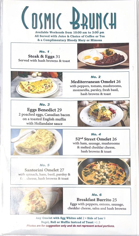 Welcome to Cosmic Diner, a stellar destination situated in the heart of New York City where American comfort food shines. The menu boasts an array of delightful options, perfect for any time of day—whether you're craving a hearty breakfast, a leisurely lunch, or a late-night snack. Patrons rave about their chicken tenders and cheesecake, which exemplify the delicious, homey feel that this diner offers.